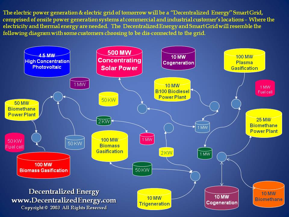 The electric grid of the 21st century (see slide below) will be Decentralized, Smart, Efficient and provide "carbon free energy" and “pollution free power” to customers who remain on the electric grid. Some customers will choose to dis-connect from the grid entirely. (Electric grid represented by the small light blue circles in the slide below.)